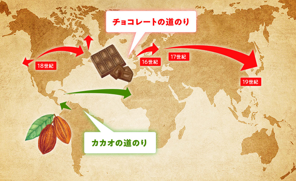 その後イギリスのフライ社が、カカオマス・カカオバター・砂糖を組み合わせることで、甘くて口どけのよい「食べるチョコレート」を完成させました。