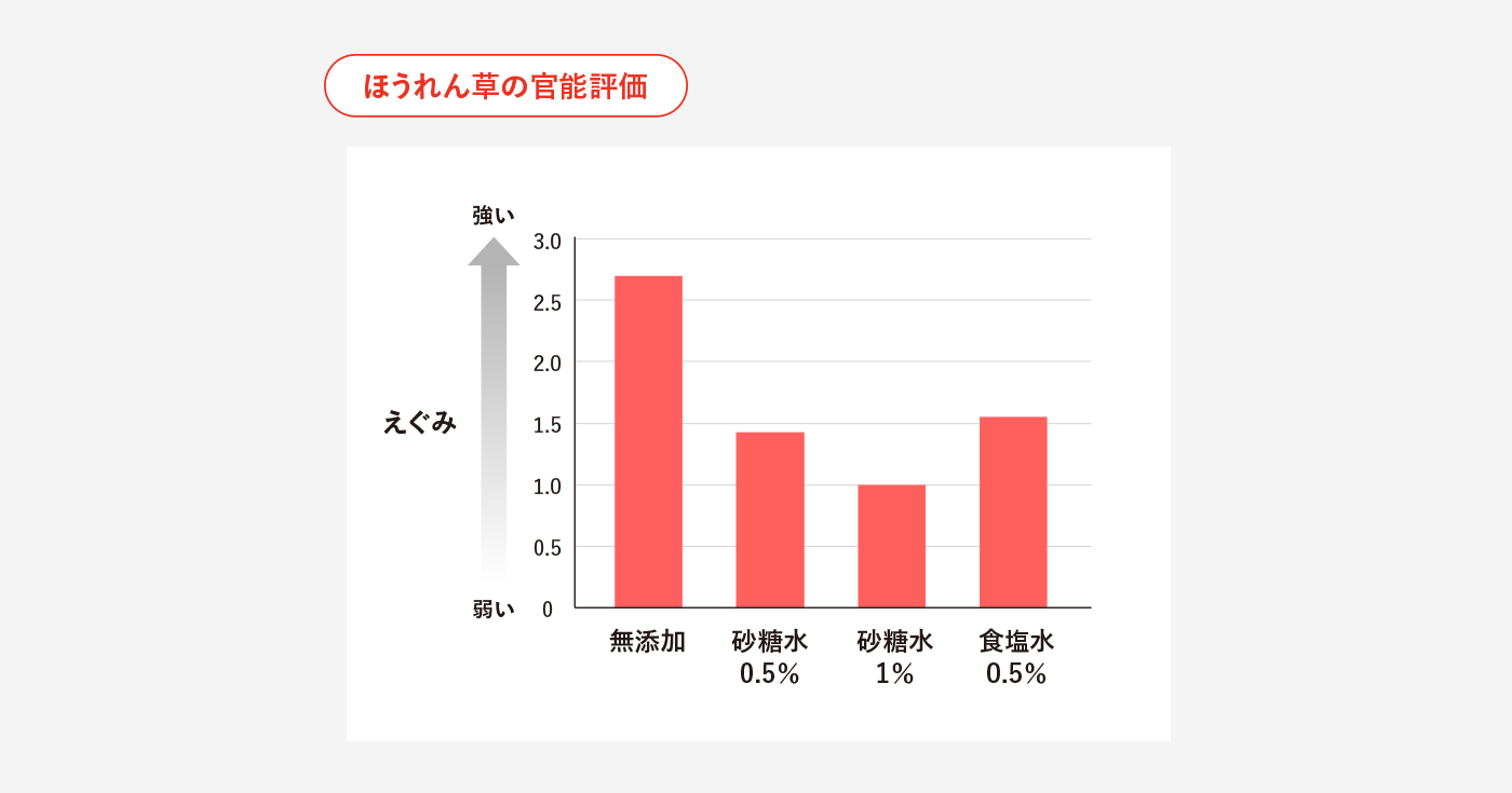 砂糖と塩では同じくらいのえぐみ低減効果があり、砂糖は多く加えた方がより高いえぐみ低減効果が認められました。また砂糖10 gを加えても、ほうれん草自体に砂糖の甘味は移行しておらず、「甘くなっていない」「むしろ食べやすい」といった評価が多数得られました。