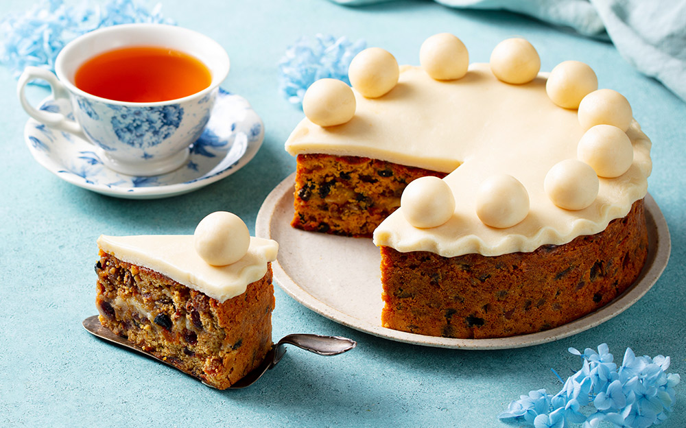 イギリスには、母の日からイースターの時期に、「シムネルケーキ」を食べる習慣があります。ドライフルーツをたっぷり使ったフルーツケーキに、マジパン(砂糖とアーモンドで作るペースト)を重ねて焼き上げたお菓子で、家庭で手作りされたり、ケーキショップに出回ります。丸いマジパンボールが乗っているのが特徴で、愛らしい見た目は、春の訪れを感じさせるアイコンのような存在です。