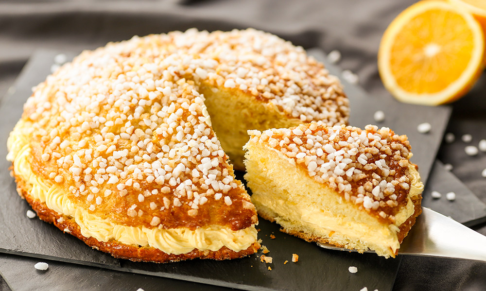 南フランス発祥のタルト・トロペジエンヌは、ブリオッシュ生地にクリームをたっぷり挟んだケーキです。サクッとした食感の砂糖の粒、ワッフルシュガー (あられ糖)が乗っている見た目が特徴です。フランスでは母の日に家族でケーキを囲む文化があり、パティスリー(洋菓子店)には母の日限定のスイーツが並びます。バターと砂糖がたっぷり使われたリッチな甘さは、特別な日だからこその贅沢なケーキです。