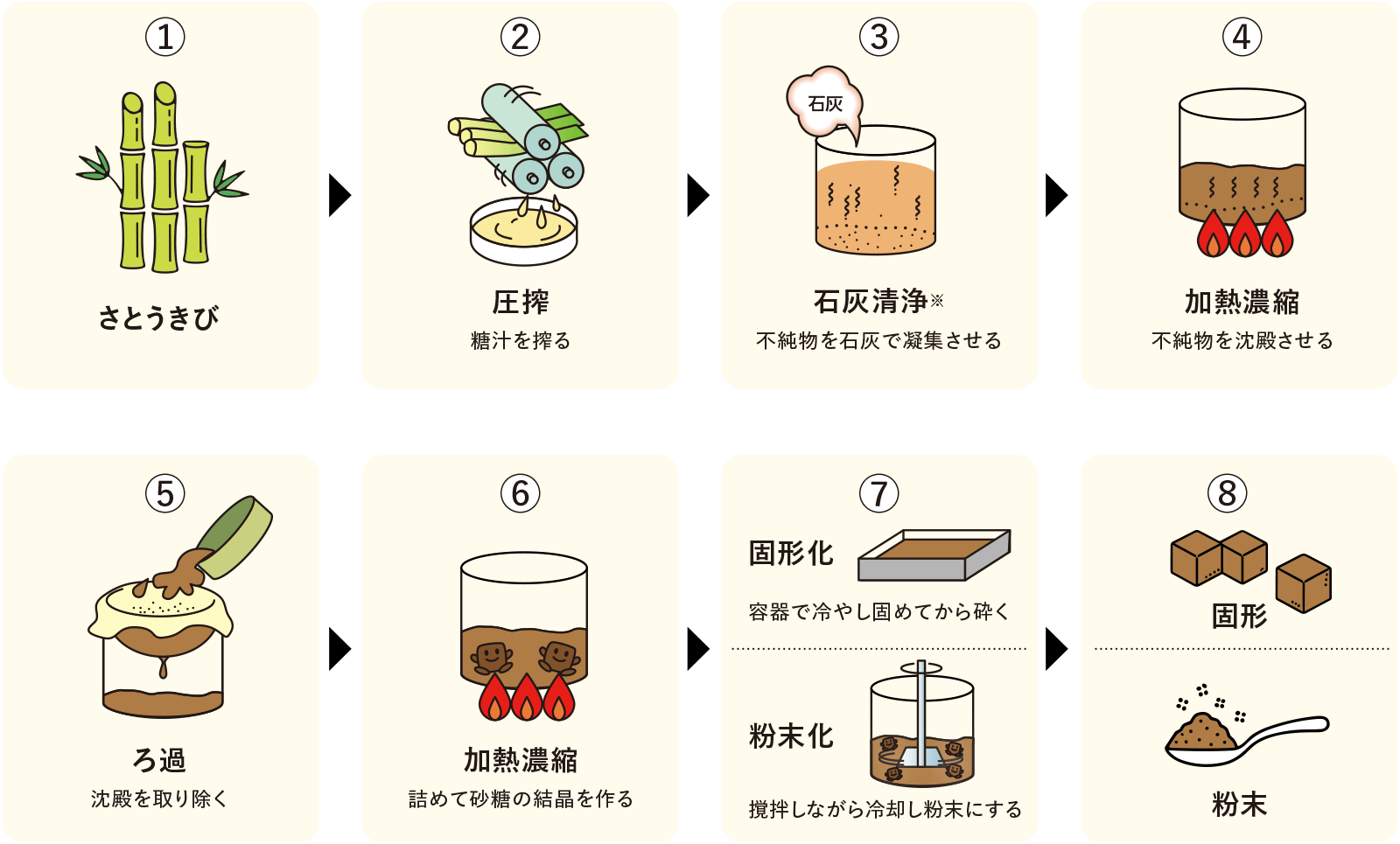 その大きな理由は、製造工程における「温度」と「精製度」の違いにあります。上白糖やグラニュー糖などの精製糖は、純度の高いショ糖を結晶として取り出すことを目的としているため、不純物や色、香りのもととなる成分や糖みつ分をできるだけ取り除く工程が加えられます。また、煮詰める際も圧力を下げて温度が上がりすぎないように管理されるため、糖の分解や反応が起こりにくく、結果として香りは控えめでクセのない仕上がりになります。