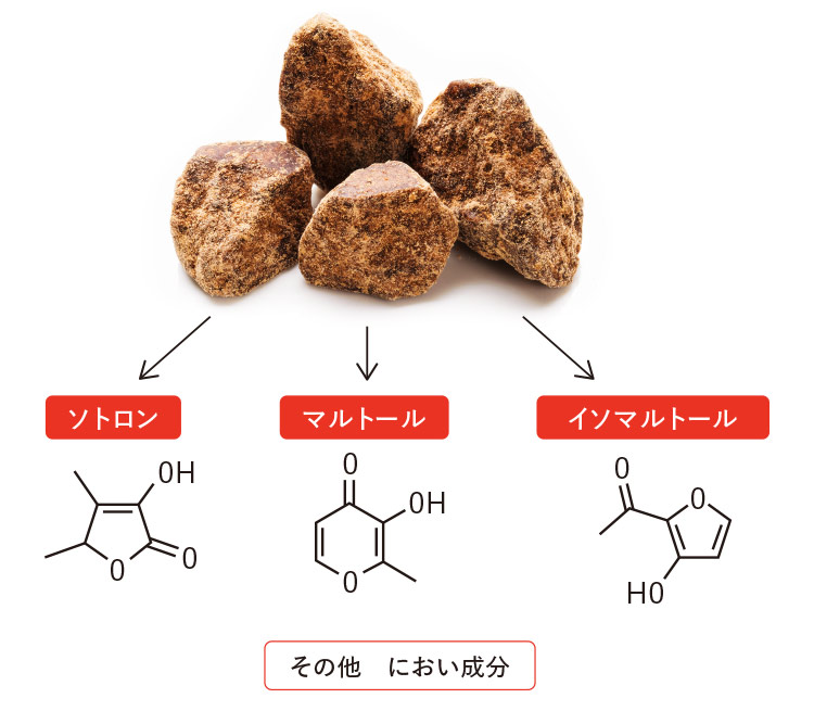 黒糖の香りは、ひとつの成分からできているわけではありません。「甘い香り」「香ばしい香り」「黒糖特有の香り」など、数十種類の香気成分が含まれています。