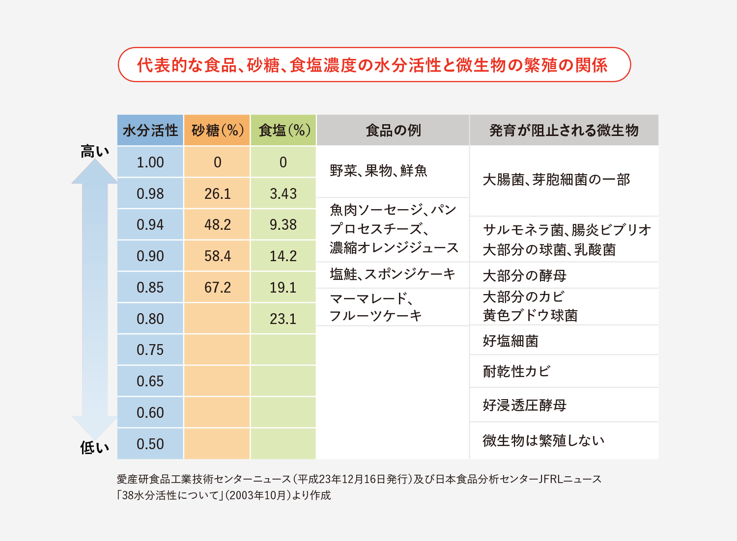 砂糖や塩を加えることでこの水分活性が下がり、添加量が増えるほど保存性は高まります。