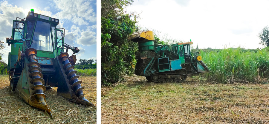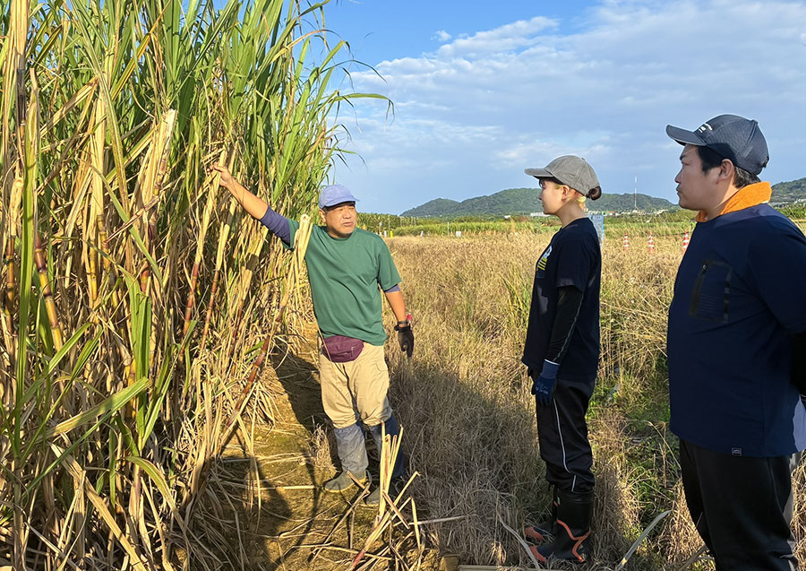 2026年2月中旬、グループ会社である石垣島製糖株式会社の協力の下、石垣島製糖の保有する農場と工場を訪問しました。農場では、まずハーベスターと呼ばれる農機でさとうきびを収穫する様子を見学しました。今回使用されていたのは小型のハーベスターですが、3m近い高さまで成長したサトウキビをみるみる刈り取り、容易に搬出できるよう次々に短く切断してフレコンバッグに投入していく様子は迫力がありました。機械で刈り取る場合、雨が降ると地面がぬかるんでなかなか刈り取りが進まなくなる点や、晴れると南国のため暑さで熱中症の危険があり、天候に左右されるなどのご苦労を農家の方から直にお伺いすることが出来ました。