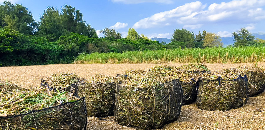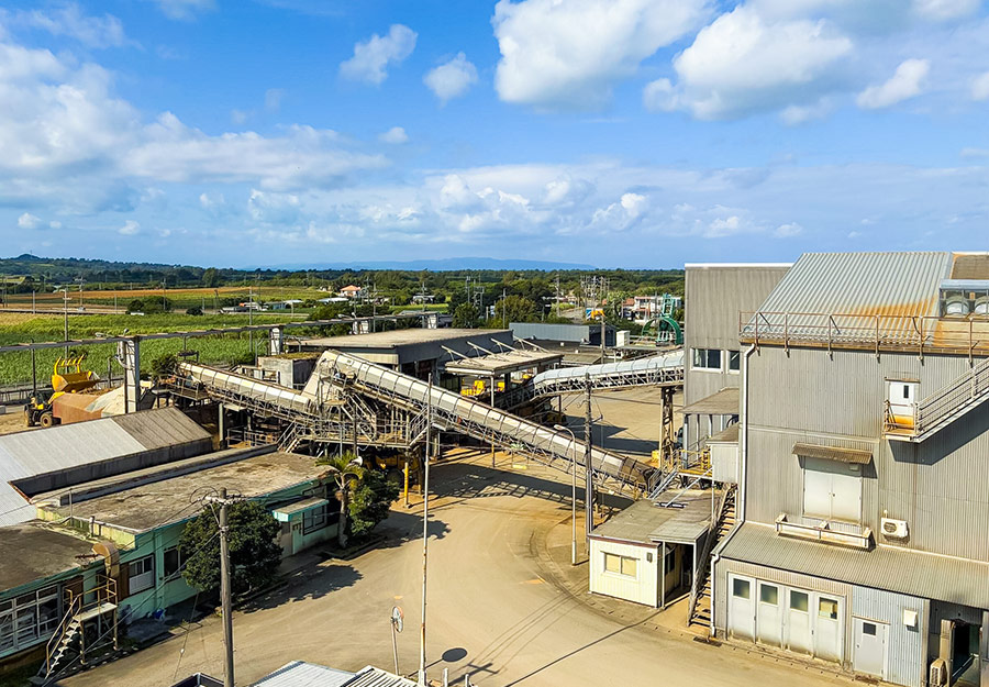 刈り取ったサトウキビは工場に搬入されたのち葉を落とし、30センチ程度の長さに裁断されて抜き取り検査をします。ここで落とした葉がらは圧縮してブロック状にし、農家で家畜の敷き藁や畑の土留めに利用されます。検査の抜き取りを終えたサトウキビは搬送ラインに投入され、5連の圧搾機で余すところなく糖汁を絞られたのち、不純物の沈殿除去、濾過、濃縮、という工程を経て結晶化され砂糖の原料となる粗糖となります。サトウキビの搾りかすはバガスとよばれ、工場内でボイラーの燃料や不純物を取り除く際のフィルターの役目を果たします。サトウキビは粗糖を製造する段階で余すところなく利用され、まさにサステナブルな農作物であることを実感しました。