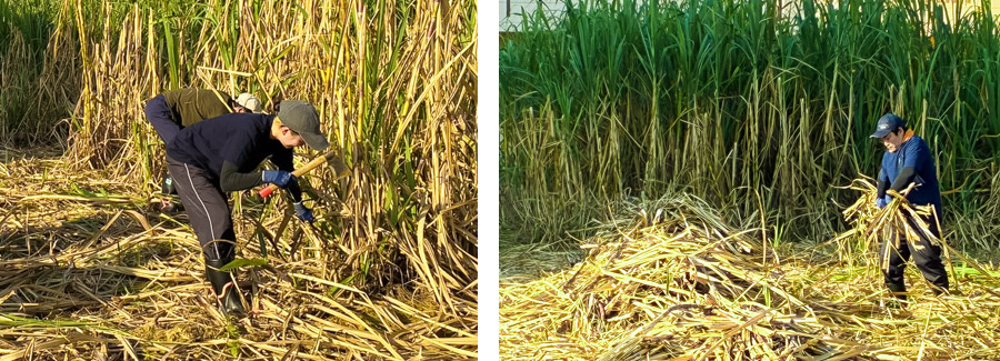 サトウキビは最初に梢頭部と呼ばれる上部の葉っぱの部分を切り落とし、その後、地面ギリギリの部分で刈り取り、積み上げていきます。良く育ったサトウキビは茎も太く、「刈り取る」というより「切り倒す」という表現の方がしっくりきます。プロは一撃で切り倒していましたが、初心者は…コツをつかむまで、何度も何度も斧を振っており、手のひらにマメを作った参加者も。数本のサトウキビをまとめて山に積んでいく作業も重労働です。