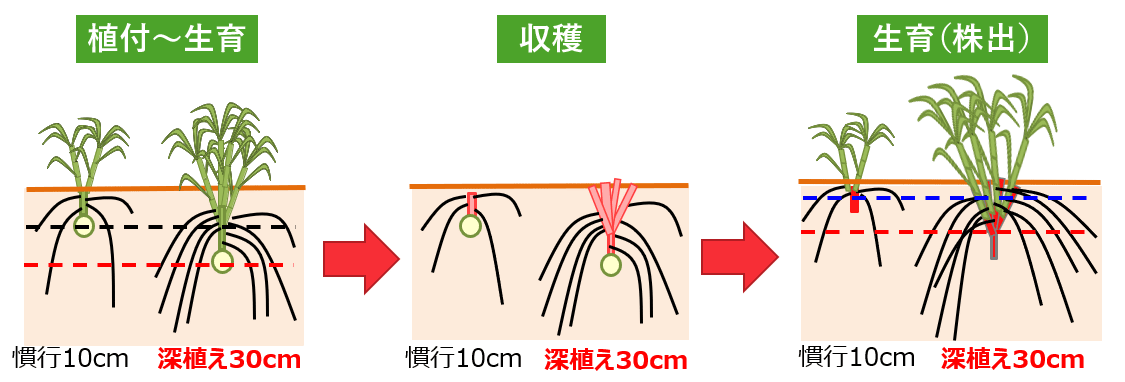 サトウキビは収穫後も同じ株から芽が出る「株出(かぶだし)」を行うことで、同じ苗から数回収穫できます。深植えを行う事で土台の株がしっかり残るため、深い土中の水分を有効に使うことが出来、翌年以降も元気な芽が多く育つため収穫量の増加に繋がると期待されています。